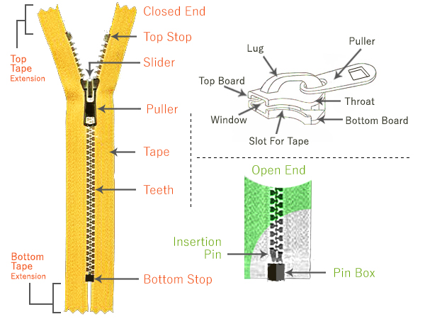 Bottom or Top stops are placed at the bottom or top end of the zipper in order to stop the slider from escaping out of the ends of the elements. Bottom stops can be made in different combinations according to the application of the zipper.